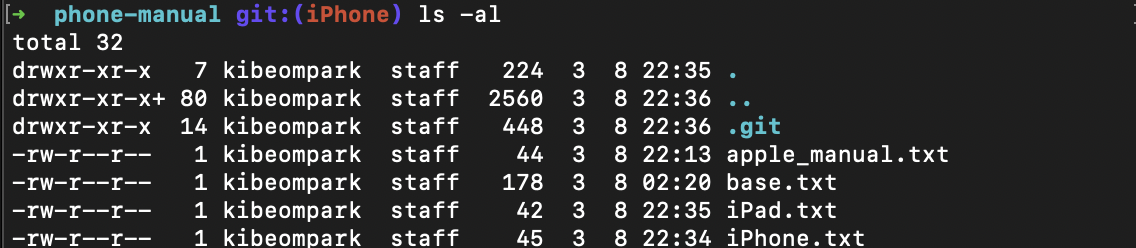 ls 명령어로 파일에 있는 자료를 확인해보면 아래와 같이 iPad에 있는 자료가 iPhone 브랜치에 있음을 알 수 있습니다.