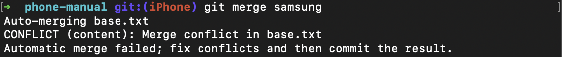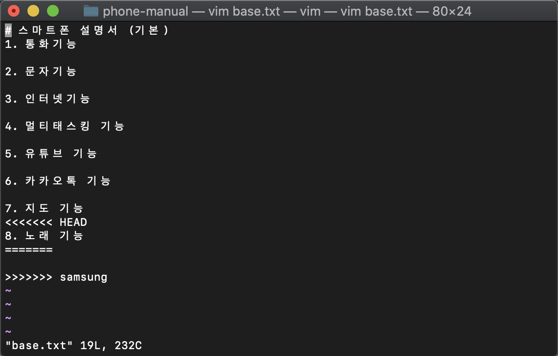 apple 브랜치와 samsung 브랜치에는 동일하게 base.txt 파일이 존재를 합니다.