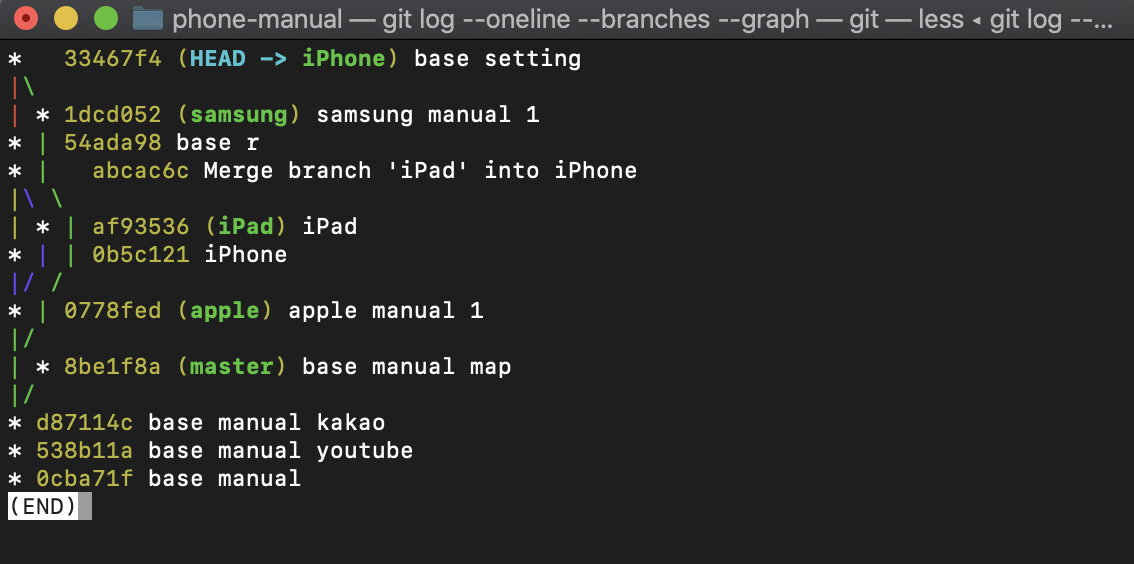 브랜치 명령어로 아이폰과 아이패드 브랜치 만들어 주시고 우선 아이폰 브랜치로 체크아웃해봅시다.