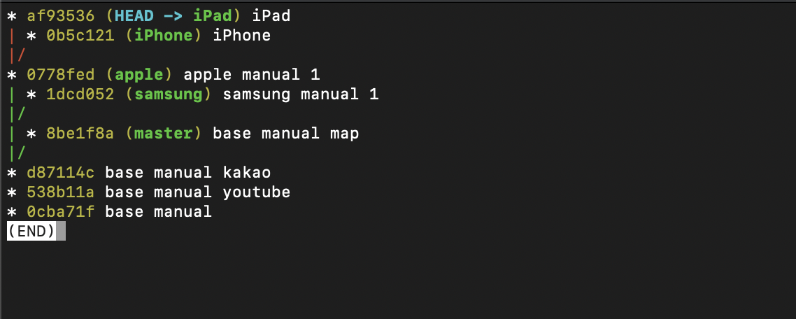 로그 브랜치 그래프 옵션으로 확인을 해보면 애플 브랜치에서 두 브랜치가 나온 것을 알 수 있습니다.