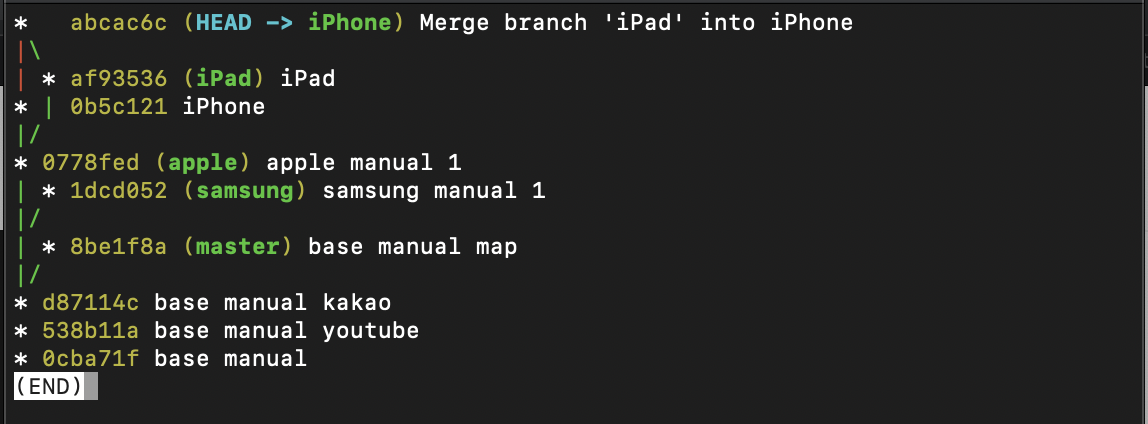 사실 진짜 이 깃을 만든 목적상 삼성과 애플 브랜치를 병합을 진행하면 안 되지만 병합을 진행해서 어떻게 변하는지 확인을 해봅시다.
