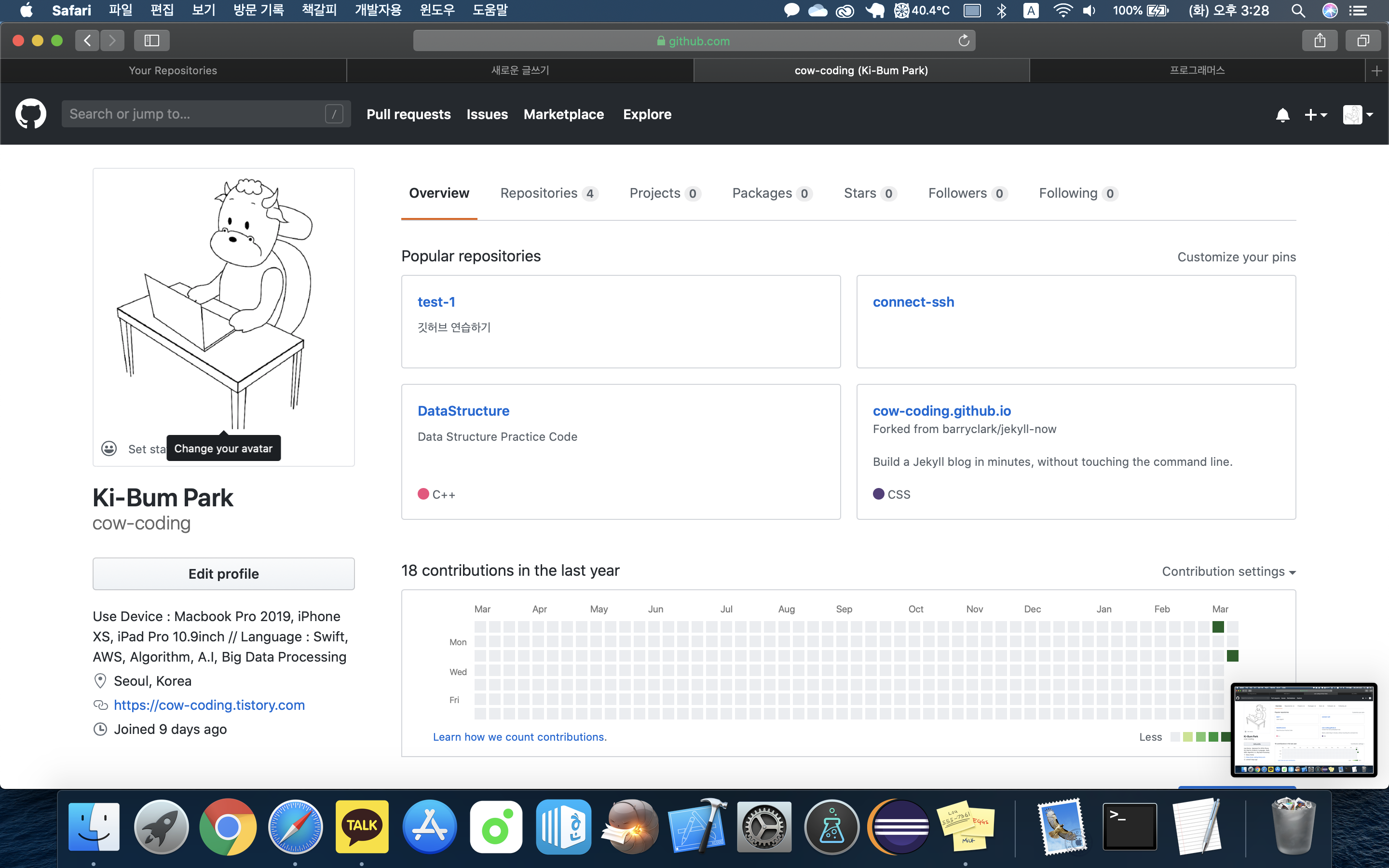 깃허브는 요즘 일종의 자기소개서 역할을 하게 됩니다. 자신의 관심사와 연구 주제를 잘 표현하면 좋습니다.