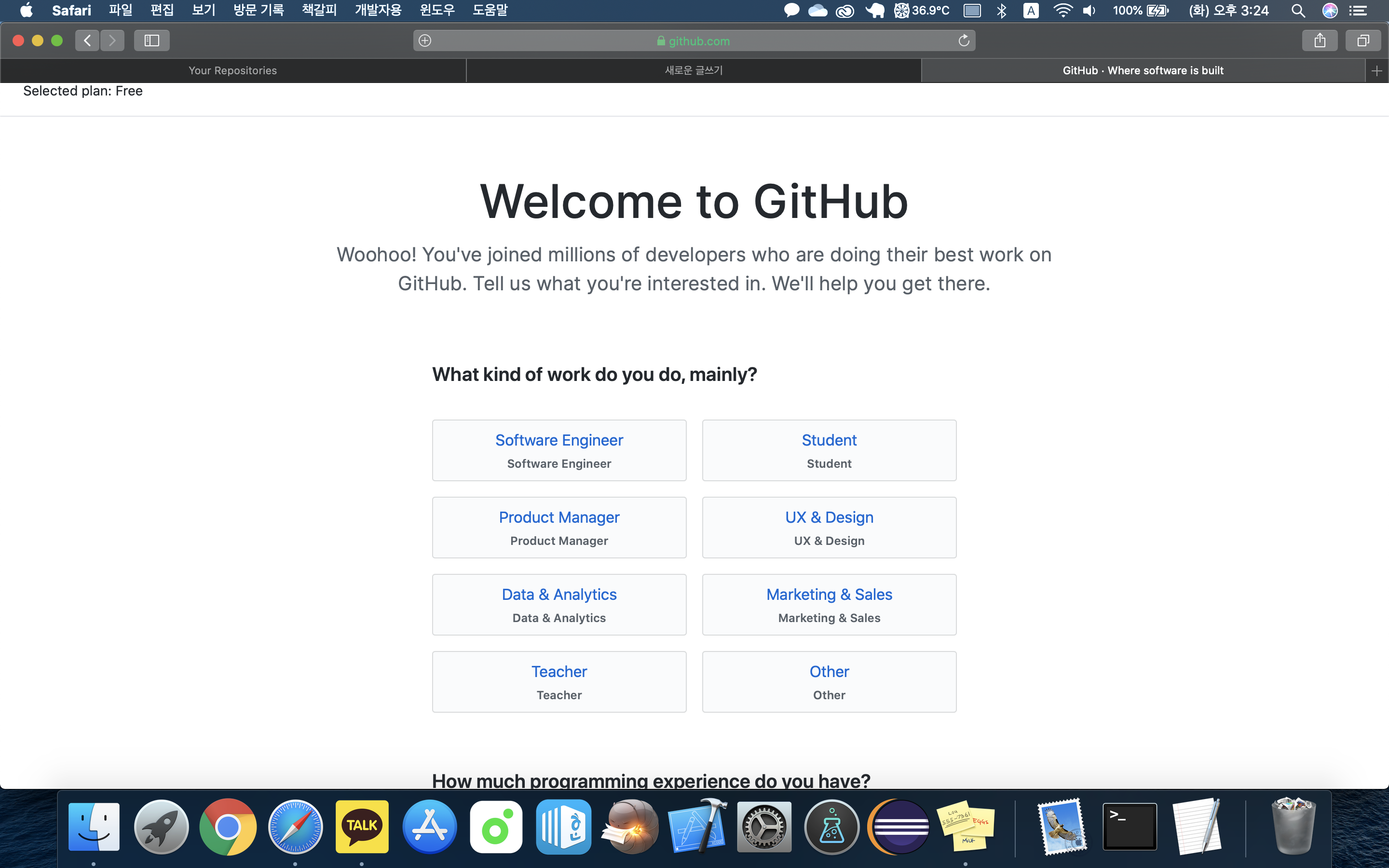 그 외에도 바로 보이는 화면에 3개 항목 입력 후 Sign up for GitHub를 누르셔도 됩니다.