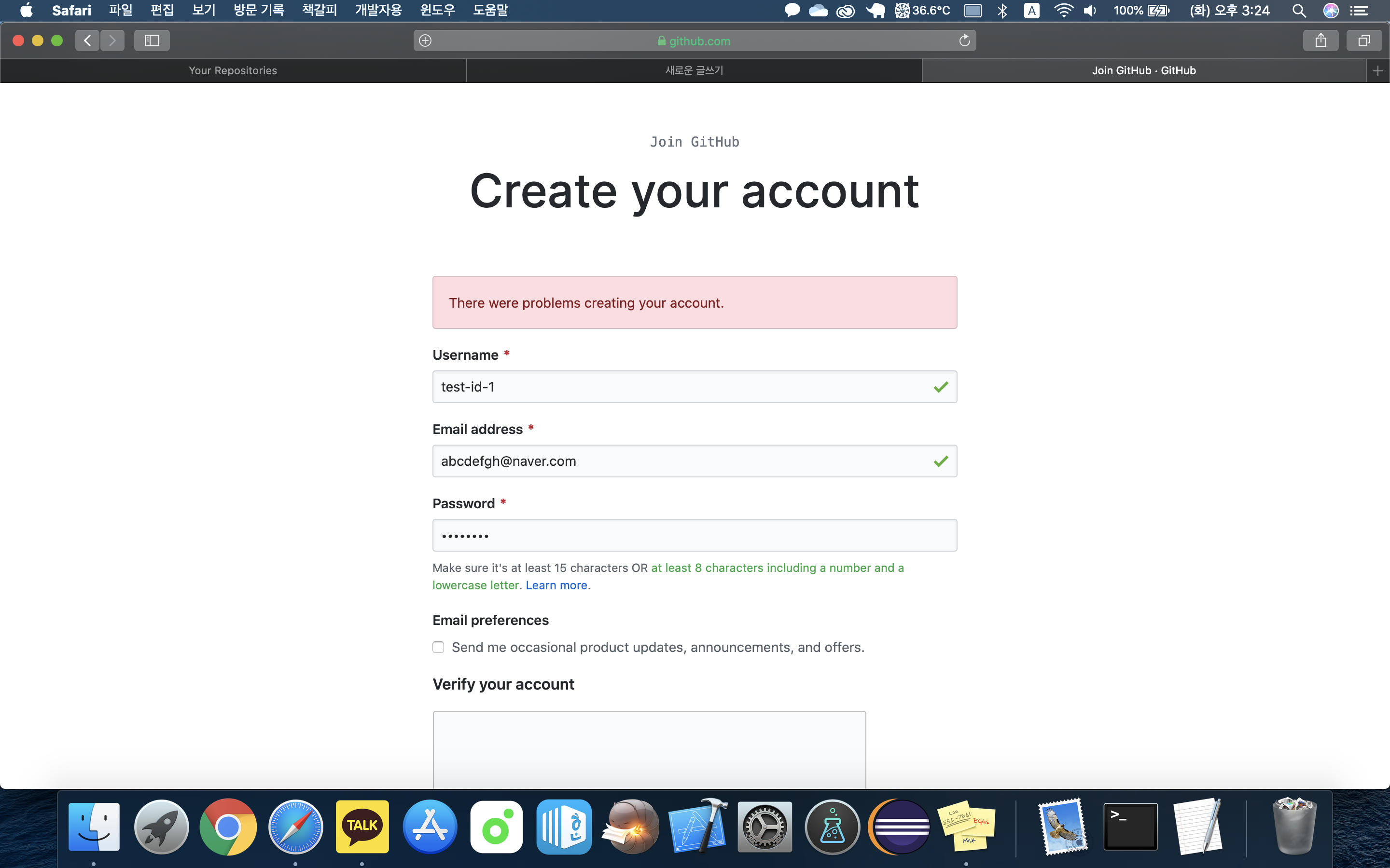 보이는 것처럼 계정 이름, 이메일, 비밀번호를 입력해주시고 가입을 진행해주시길 바랍니다.