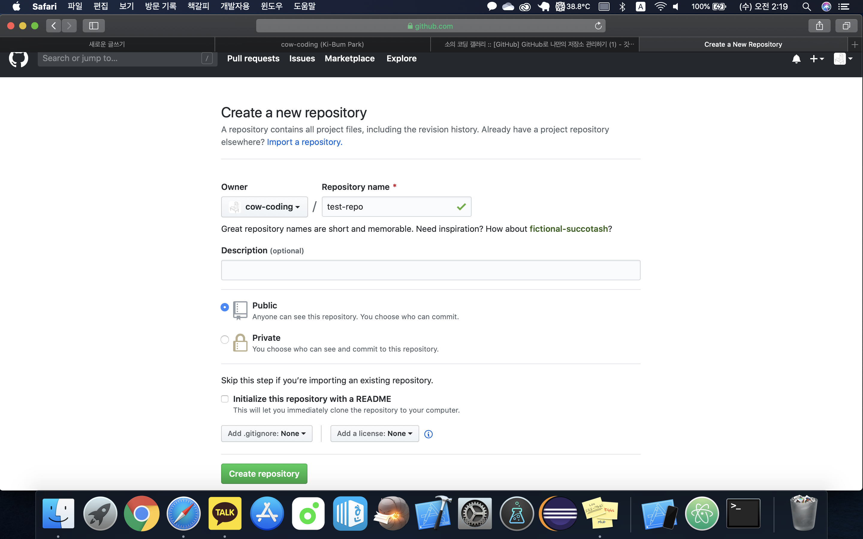 이름은 대강적으로 만들면 됩니다. 저는 test-repo로 할게요.