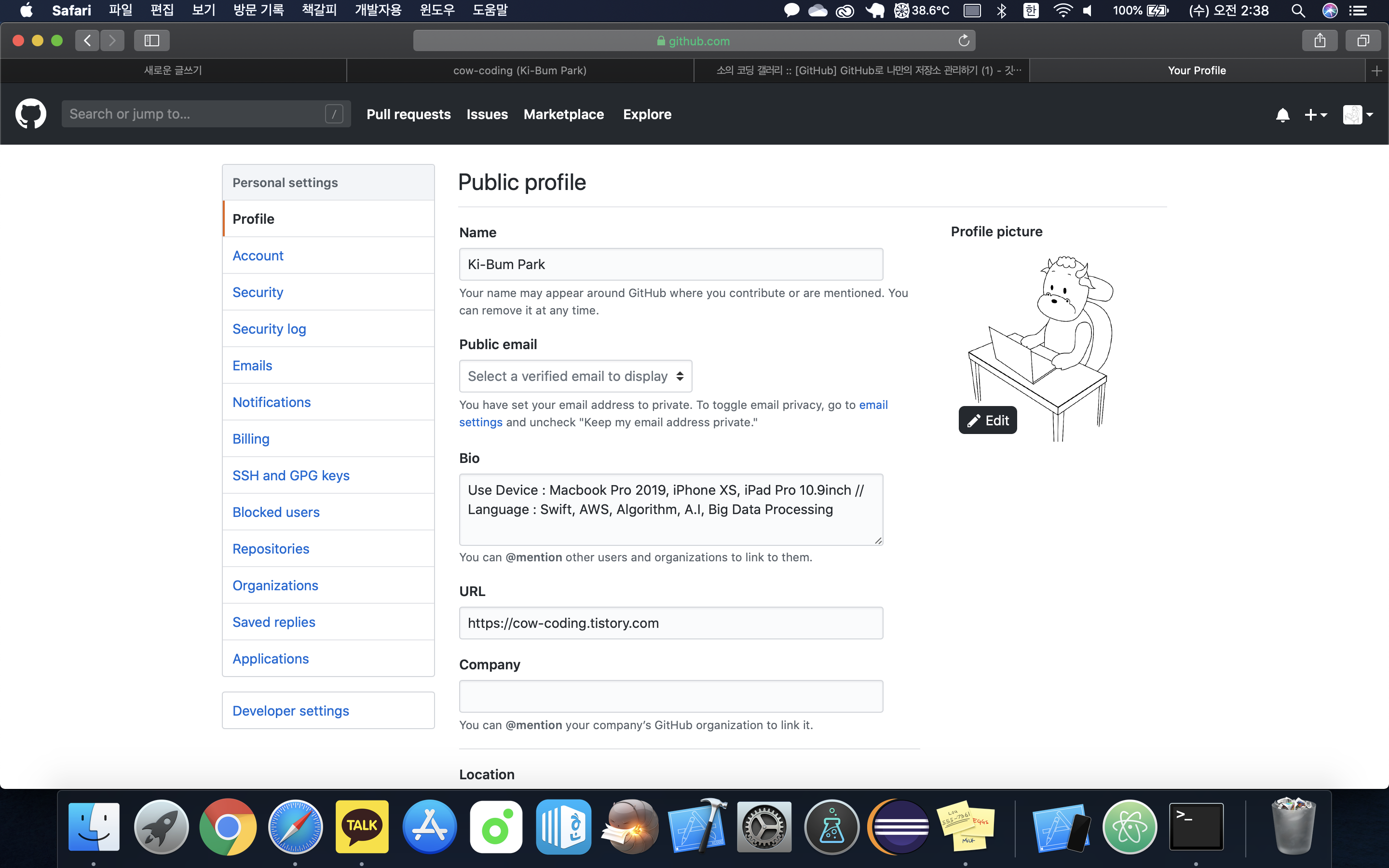 그 후 깃허브로 이동해서 프로필에 세팅으로 들어가 주세요.
