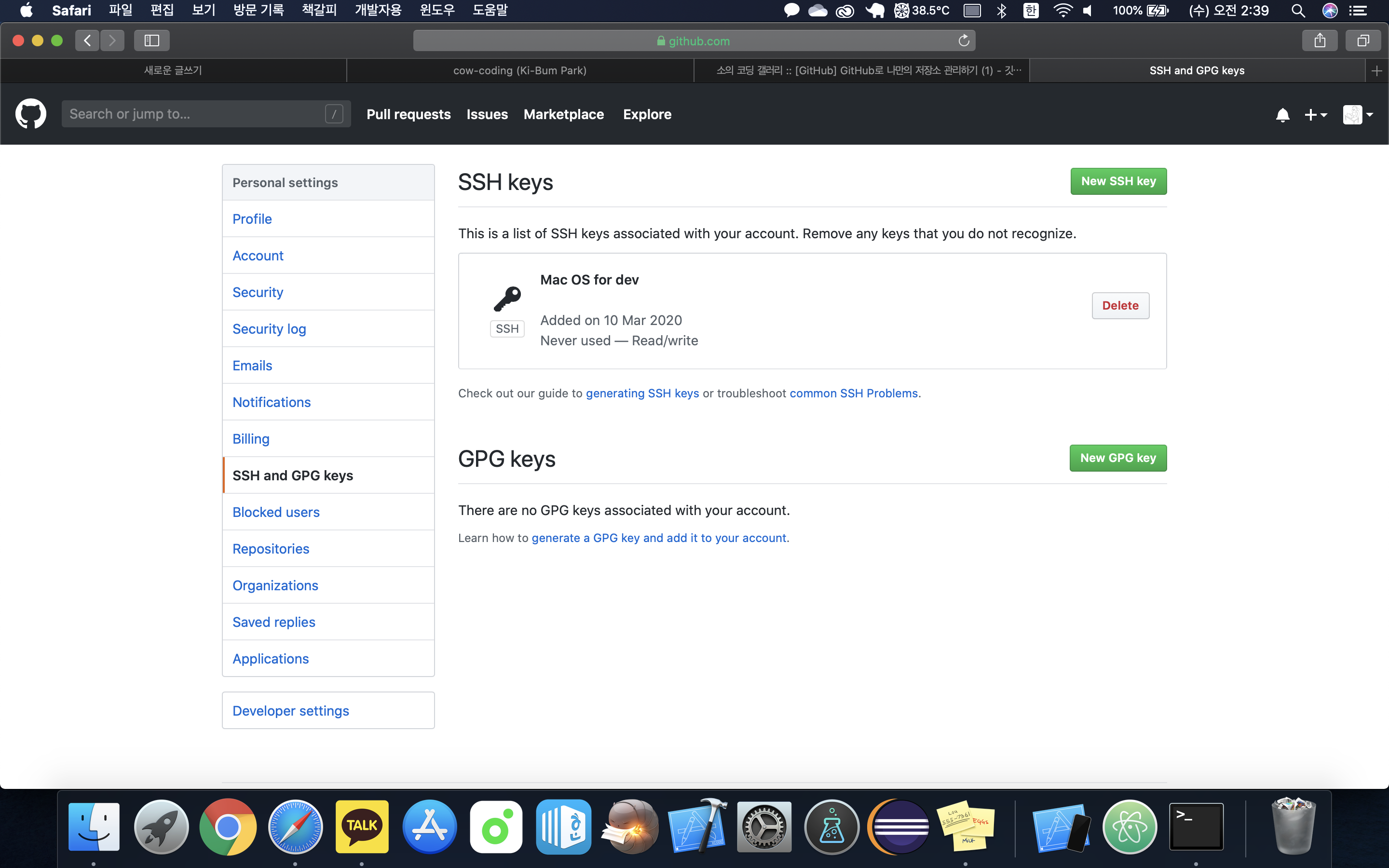좌측 8번째에 SSH and GPG keys를 눌러주세요.