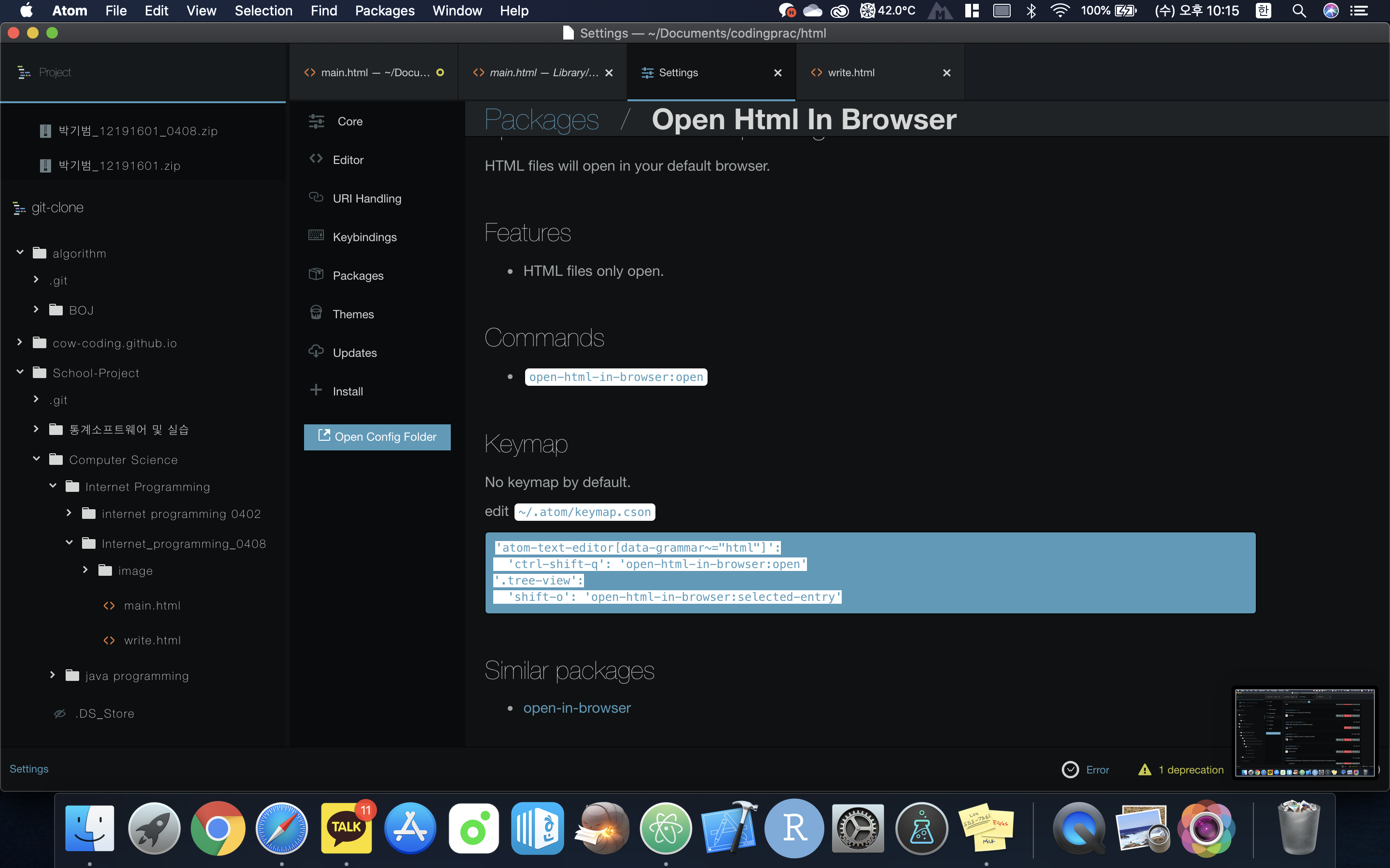 open-html-in-preview는 html 파일을 아톰에서 직접적으로 브라우저로 연결을 해주는 패키지입니다.