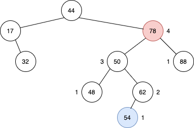 54를 가진 노드가 추가되면서 78 값을 가진 노드에서 높이 밸런스 특성이 깨졌다. 설명의 편의를 위해서 노드의 값을 노드의 이름으로 부르겠다. 78노드의 높이가 4인 이유는 자식의 높이 중 가장 큰 높이+1이 부모의 높이가 되기 때문이다.