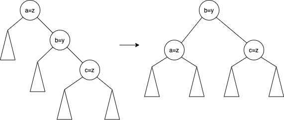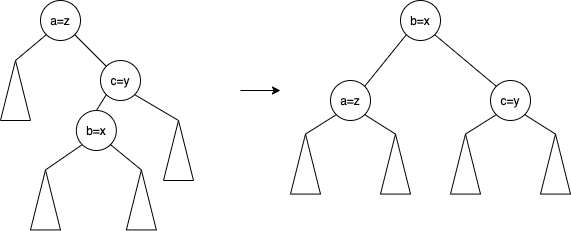 실제로 이 과정은 이렇게 보면 단순하게 회전이 진행된 것 같지만 2번 회전한 경우에 해당된다. 일반적으로 1번 회전하는 경우는 a, b, c가 일렬로 연결이 된 경우에 해당된다. 위는 a, b, c가 지그재그 형태로 이뤄진 경우로 2번 회전을 진행하게된다. 간단한 회전의 경우를 보면 아래처럼 구분된다고 보면 된다.