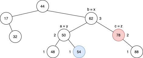 이렇게 정해진 x, y, z노드에 다시 a, b, c라는 이름을 붙여준다. a, b, c를 붙이는 조건은 중위순회를 기준으로 먼저 중위순회가 이뤄지는 순서로 이름을 붙여준다. 여기서는 y,x,z순서로 a,b,c가 붙여진다.