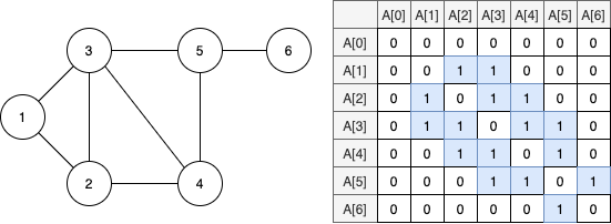 인접 행렬은 모든 정점을 2차원 배열로 만들고 저장한다. 그리고 간선의 연결 정보를 좌표로 표시해서 저장한다. 모든 정점의 순서쌍을 만들어서 저장하므로 \(O(V^2)\)의 공간복잡도를 갖는다. 따라서 상당히 많은 메모리를 차지하므로 너무 많은 정점을 갖는 그래프에서는 잘 사용하지 않는다. 하지만 특정 간선을 확인해야하는 경우에서 굉장히 빠른 속도를 보여준다.