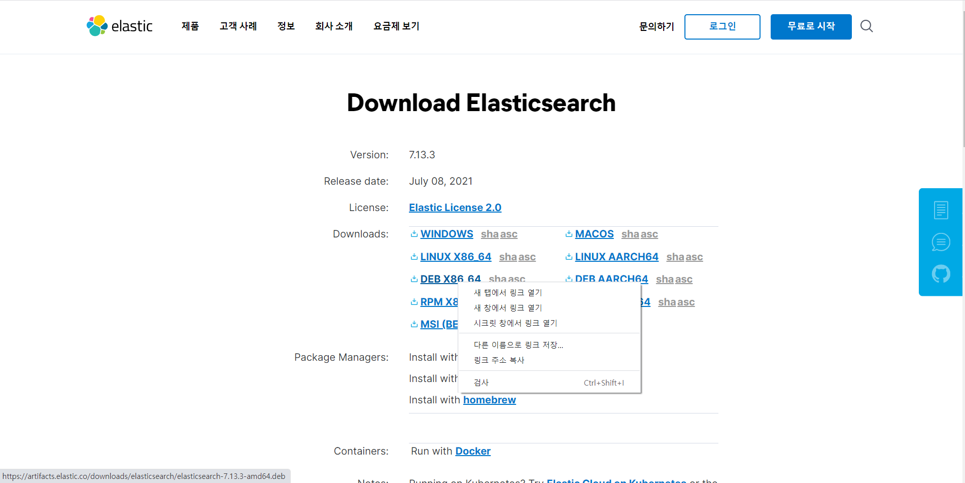 $ wget https://artifacts.elastic.co/downloads/elasticsearch/elasticsearch-7.13.3-amd64.deb