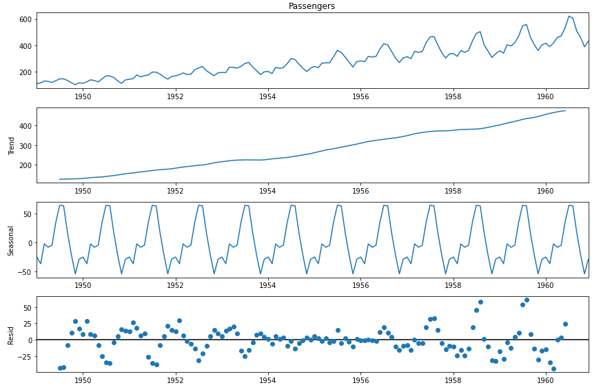 데이터의 실제 분포, 추세(경향성), 계절성, 잔차를 한번에 보여주는 방법이 있습니다. 파이썬에는 statsmodel 라이브러리에 있는 seasonal_decompose 모듈이 있습니다.